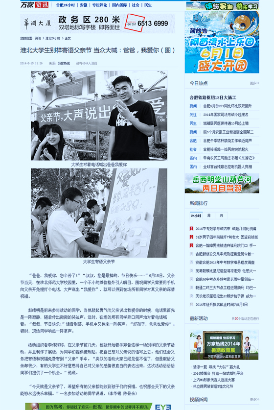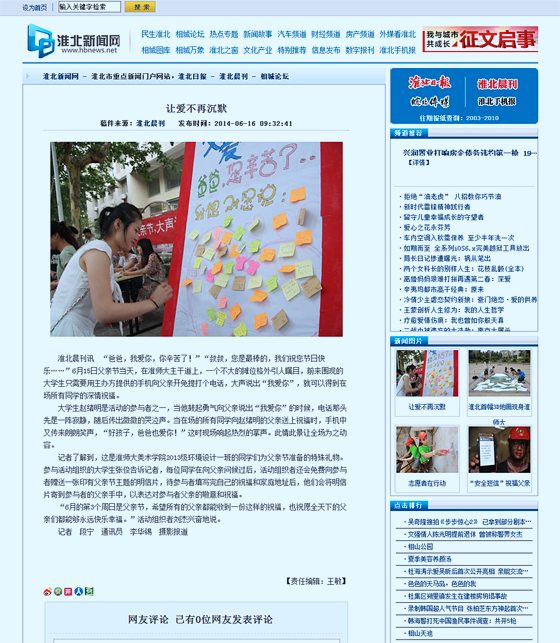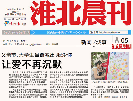 近日,“安徽万家热线”、淮北新闻网、《淮北晨刊》相继报道美术学院2013级环境设计一班“别样形式寄语父亲节”主题团日活动。
